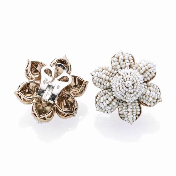 MATERIALE: oro a basso titolo e microperle DESCRIZIONE: paio di orecchini a clips, ciascuno realizzato come un fiore interamente impreziosito da microperle, firmati F.lli de Maria, recano il marchio 500 MISURE: cm 1.6 x3h PESO: gr 21