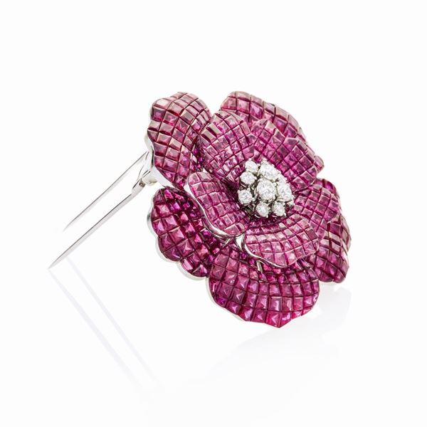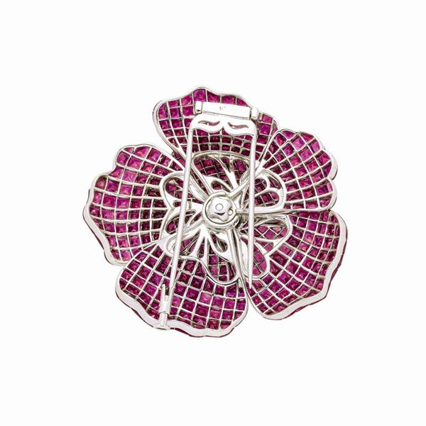 Paio di orecchini a clips in oro bianco, oro giallo, diamanti e smeraldi