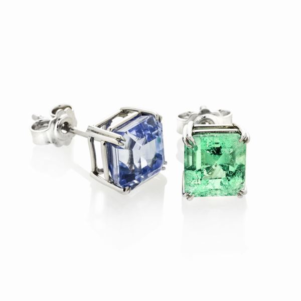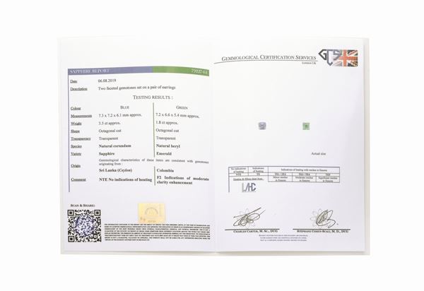 MATERIALE: oro bianco, smeraldo e zaffiro DESCRIZIONE: paio di orecchini a clip, uno realizzato con zaffiro e l'altro con smeraldo entrambi taglio ottagonale, recano il marchio 750, corredato di certificato Gemmological Cetification Services n. 79227-64, in data 06-08-2019 MISURE: cm 0.6x0.6 h PESO: zaffiro ct. 3.5, smeraldo ct. 1.8, gr 2.6