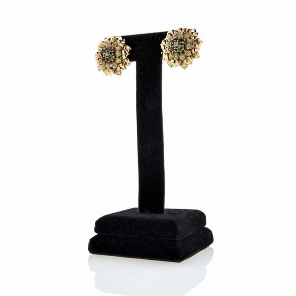 Paio di orecchini a clips in oro giallo, diamanti, rubini, zaffiri e smeraldi