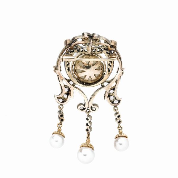 Spilla pendente in oro a basso titolo, argento, diamanti, grande perla mabè e perle coltivate