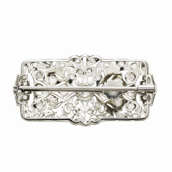 MATERIALE: oro bianco e diamanti DESCRIZIONE: spilla pendente di ispirazione floreale realizzata a tricot, impreziosita con diamanti taglio vecchio, rose coronè e rose di diamante, trasformabile in pendente e corredata di catena a maglie intrecciate MISURE cm 2.5x 5.2h PESO: diamanti ct 3.40 complessivamente gr 16.0