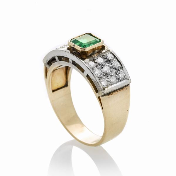 Anello a fascia in oro giallo, oro bianco, diamanti e smeraldo
