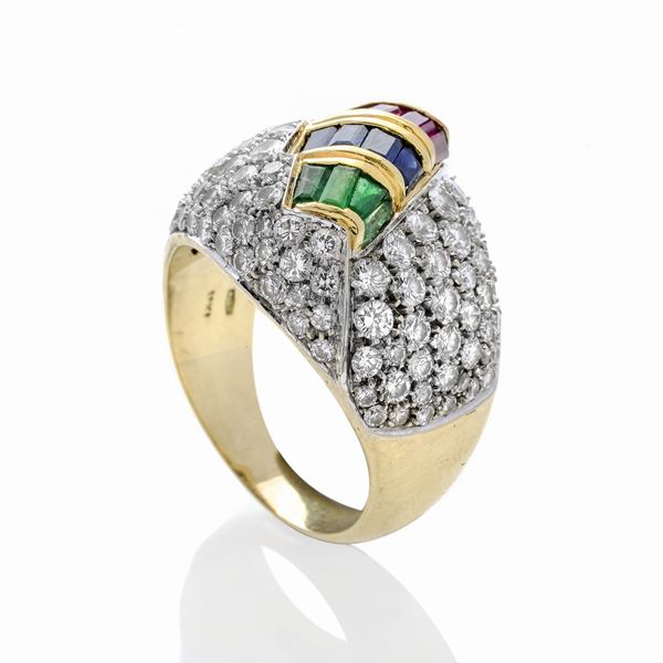 Anello a fascia in oro giallo, oro bianco, diamanti, rubini, zaffiri e smeraldi