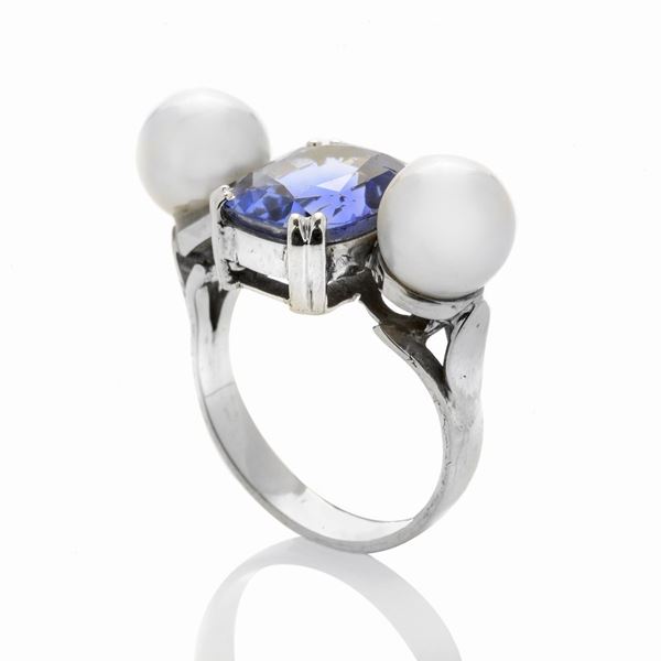 MATERIALE: oro bianco, perle e quarzo azzurro DESCRIZIONE: anello a ponte realizzato con al centro quarzo taglio ovale tra due perle, reca il marchio 750 MISURE: anello 15.5 PESO: perle mm 8, gr 8.2