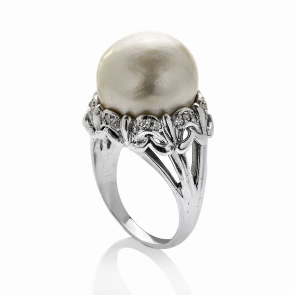 MATERIALE: oro bianco, diamanti e grande perla dei mari del Sud DESCRIZIONE: anello realizzato con grande perla su base sagomata, impreziosita con piccoli diamanti, reca il marchio 750 MISURE: anello 16 PESO: perla mm 15.6, gr 15