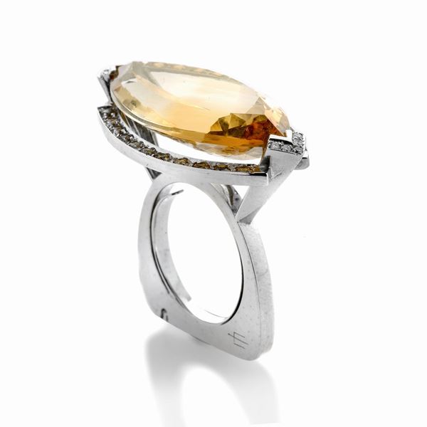 Anello in oro bianco, diamanti e quarzo citrino