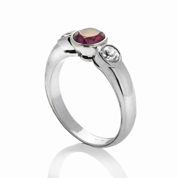 Anello in oro bianco, diamanti e rubino