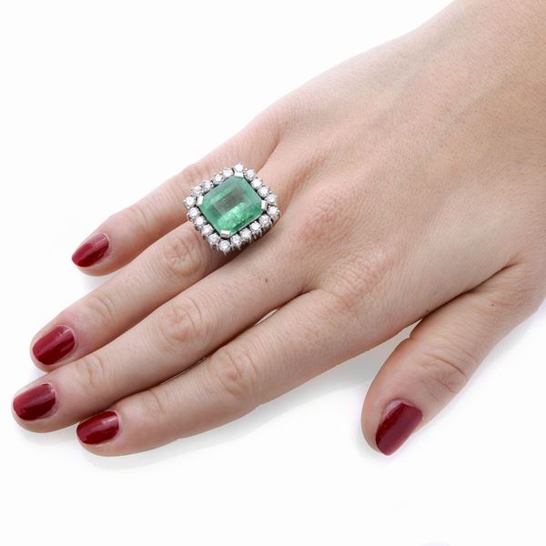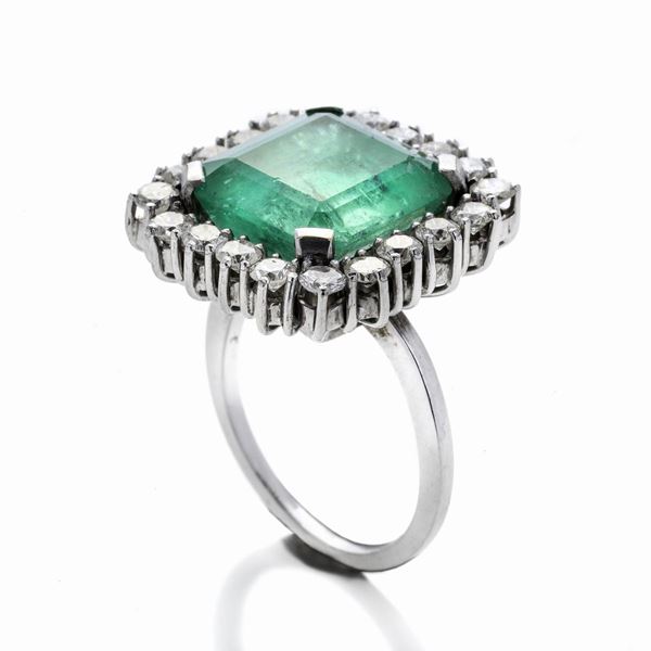 MATERIALE: oro bianco, diamanti e smeraldo DESCRIZIONE: anello realizzato con grande smeraldo taglio quadrato, incorniciato da diamanti taglio brillante MISURE: anello 18 PESO: smeraldo ct 11, diamanti ct 1.60, colore I, P1, gr 12.2