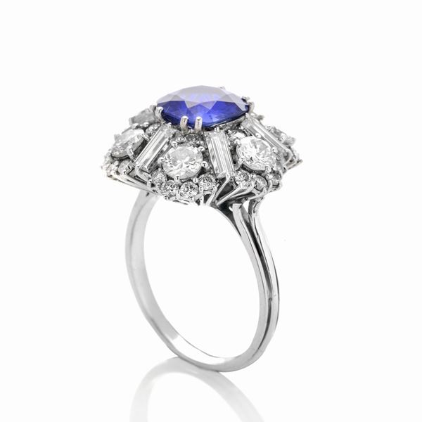 MATERIALE: oro bianco, diamanti e zaffiro DESCRIZIONE: anello di ispirazione floreale, realizzato con zaffiro taglio ovale su una alta base sagomata impreziosita con diamanti taglio brillante alternati a taglio baguette, reca il marchio 750 MISURE: anello 14.5 PESO: zaffiro ct 2.50, diamanti ct 2.80, colore H, SI, gr 6.4