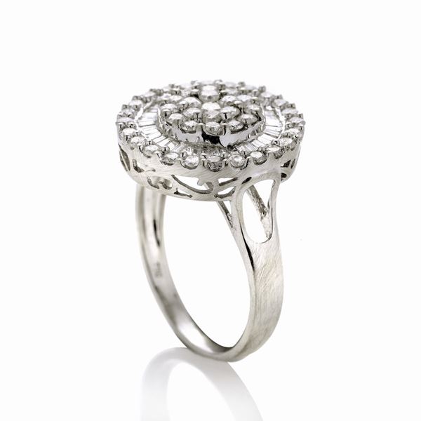 MATERIALE: oro bianco e diamanti DESCRIZIONE: anello a scudo, interamente impreziosito da pavè di diamanti incorniciati da diamanti taglio brillante e diamanti taglio baguette, reca il marchio 750 MISURE: anello 14 PESO: diamanti ct 1.70, colore H, SI2, gr 4.7