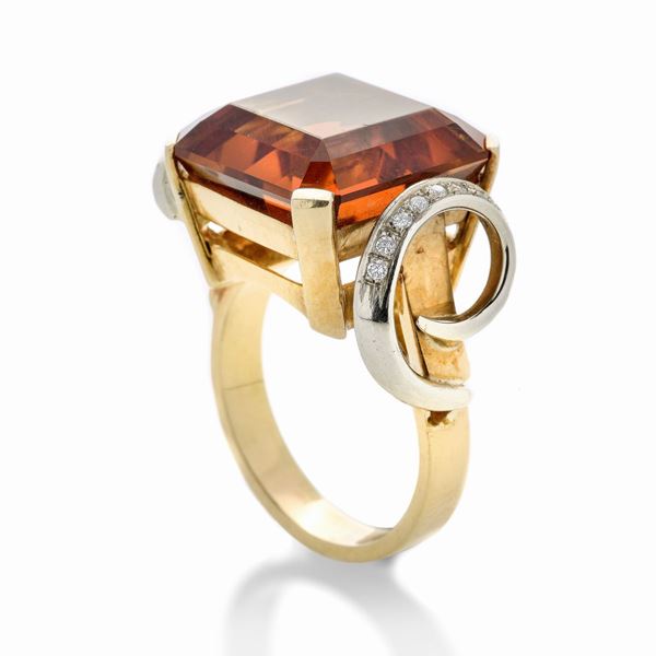 Anello in oro bianco, oro giallo, diamanti e quarzo cognac
