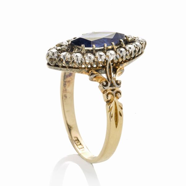 MATERIALE: oro giallo, argento, diamanti e zaffiro DESCRIZIONE: anello a losanga realizzato con uno zaffiro taglio navette incorniciato da diamanti taglio vecchio, reca il marchio 18kt MISURE: anello 15 PESO: zaffiro ct 1.10, diamanti ct 0.40, gr 4.2