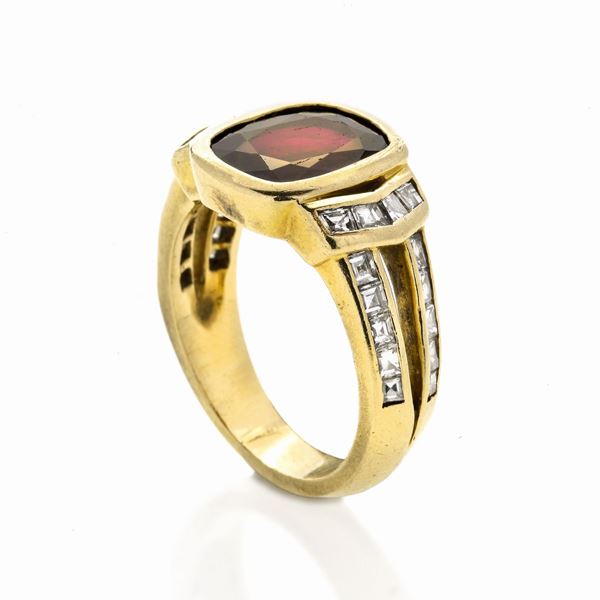 MATERIALE: oro giallo, diamanti e rubino DESCRIZIONE: anello a fascia realizzato con al centro rubino taglio ovale impreziosito ai lati da diamanti taglio carrè MISURE: anello 13 PESO: rubino ct 1.90 circa, diamanti ct 0.70, gr 8.3