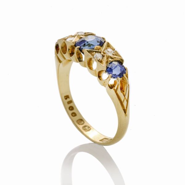 MATERIALE: oro giallo, diamanti e zaffiri DESCRIZIONE: anello realizzato con zaffiro taglio ovale impreziosito su ciascun lato con due diamanti taglio vecchio ed un altro zaffiro taglio ovale, reca il marchio 18kt MISURE: anello 14 PESO: zaffiri ct 1.0 circa, diamanti ct 0.15, gr 3.7