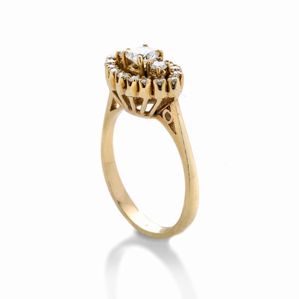 MATERIALE: oro giallo e diamanti DESCRIZIONE: anello realizzato come una navette centrata da diamante taglio brillante incorniciato da diamanti più piccoli MISURE: anello 15 PESO: diamante centrale ct 0.50 circa, diamanti laterali ct 1.0, gr 4.0