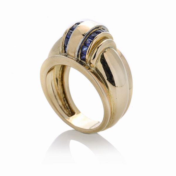 MATERIALE: oro giallo e zaffiri DESCRIZIONE: anello bombato impreziosito con zaffiri taglio carrè disposti a binario MISURE: anello 18 PESO: gr 15.8