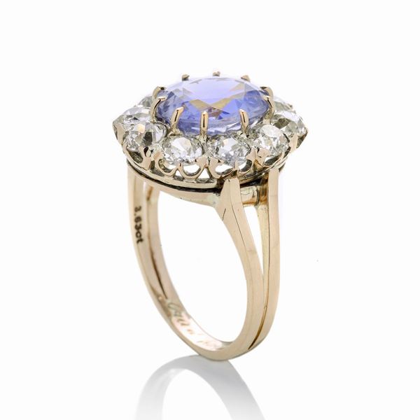 MATERIALE: oro rosa, diamanti e zaffiro Ceylon naturale DESCRIZIONE: anello a margherita con al centro uno zaffiro Ceylon naturale taglio ovale, incorniciato con dieci diamanti taglio vecchio, reca inciso all'interno "Ora et semper" MISURE: anello 13 PESO: zaffiro Ceylon naturale ct 3.87, corredato di certificato Gemmological Cetification Services n. 80236-36, in data 17-10-2019 , diamanti ct 1.20 circa complessivi PESO: gr 5.0