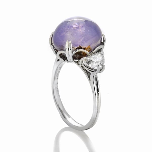 MATERIALE: platino, diamanti e zaffiro stellato viola naturale DESCRIZIONE: anello realizzato con al centro zaffiro stellato viola naturale taglio cabochon tra due diamanti taglio mezza luna MISURE: anello 12 PESO: zaffiro viola naturale ct 15.68, corredato di certificato Gemmological Cetification Services n. 79221-95, in data 27-06-2019, diamanti ct 1.25 complessivi, 7.7 gr