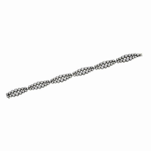 MATERIALE: oro bianco e diamanti DESCRIZIONE: bracciale realizzato con due file di diamanti taglio brillante leggermente degradè affiancati tra loro, ad imitazione del nastro, reca il marchio 750 MISURE: bracciale aperto cm 17.5 PESO: diamanti ct 6.0, colore G/H, purezza VS, gr 21.1