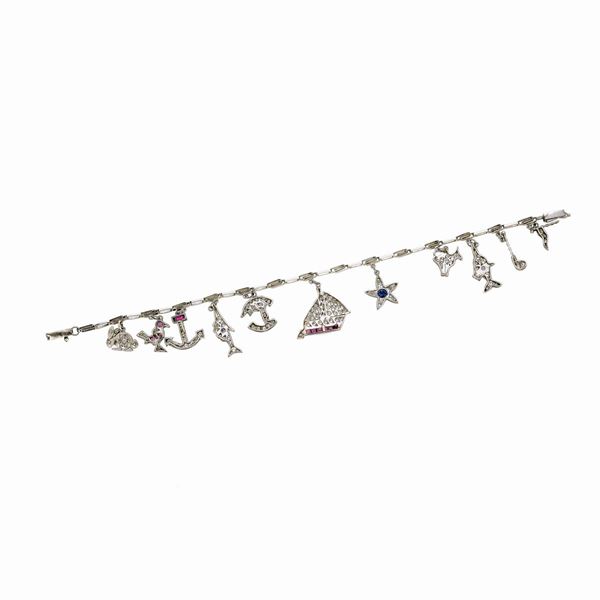 MATERIALE: oro bianco, platino, diamanti, zaffiri e rubini DESCRIZIONE: bracciale realizzato a maglie rettangolari intracciate con dieci charms ispirati a ricordi di viaggio ciascuno dei quali impreziositi con pavè di diamanti, rubini e zaffiri MISURE: aperta cm 18 PESO: gr 12.9