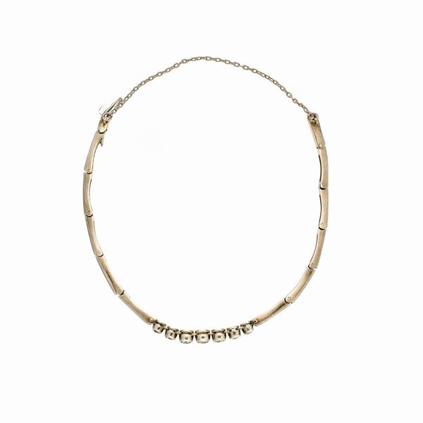 MATERIALE: platino, oro a basso titolo e diamanti DESCRIZIONE: bracciale realizzato con maglie rigide rettangolari impreziosito al centro da sette diamanti taglio vecchio degradè MISURE: diametro cm 5.2 PESO: gr 7.0