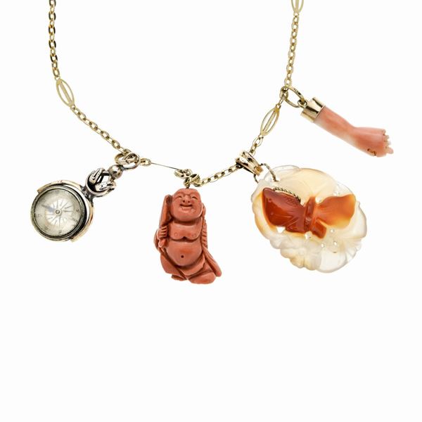 MATERIALE: oro giallo, corallo rosso e pietra dura DESCRIZIONE: lunga collana a maglie ovali piatte intrecciate con quattro charms, ciascuno realizzato come una bussola, un Buddah, una farfalla e un ciondolo scaramantico, la collana reca il marchio 750 MISURE: collana aperta cm 62 PESO: gr 52.2 complessivi