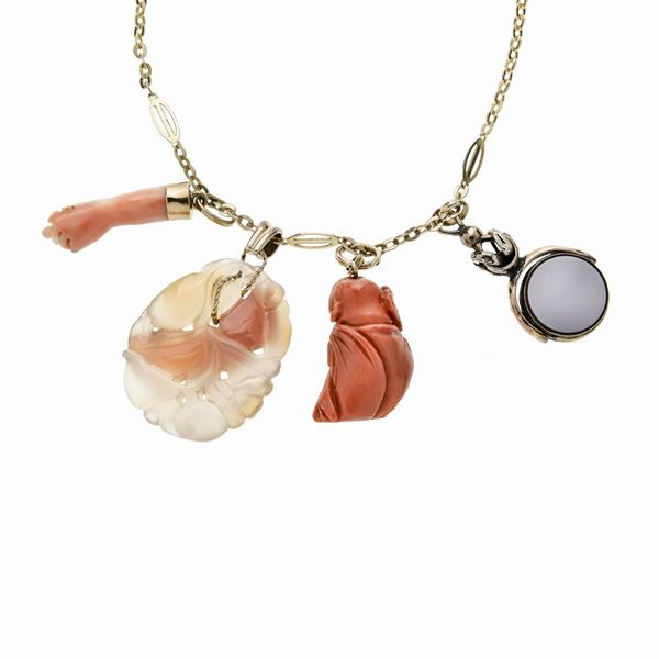 Catena in oro giallo con charms in corallo rosso e pietra dura