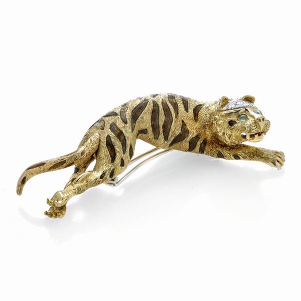 Clip tigre in oro giallo, oro bianco, smeraldi, smalti e diamanti