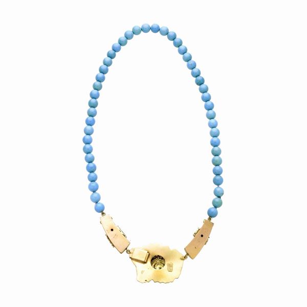 MATERIALE: oro giallo e turchese DESCRIZIONE: collana realizzata in perle di turchese con grande fermezza-pendente in oro sbalzato, di ispirazione floreale, impreziosita con piccolo diamante, firmata Zanchi, reca il marchio 750 MISURE: aperta cm 47.5 PESO: turchese mm 5; gr 50.8