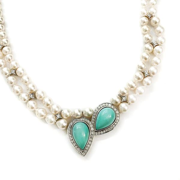 Collana in perle,oro giallo, oro bianco, diamanti e pasta di turchese