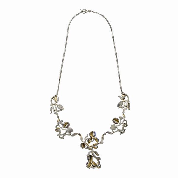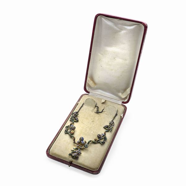 MATERIALE: argento, argento vermeille e micromosaico DESCRIZIONE: particolare collier di ispirazione floreale, eseguito ad altorilievo con tralci di foglie, orchidee e panzè interamente realizzato con micromosaici colorati nei toni del verde, del giallo, celeste e lilla, reca il marchio 800, corredato di scatola originale MISURE: aperta cm 50 PESO: gr 29
