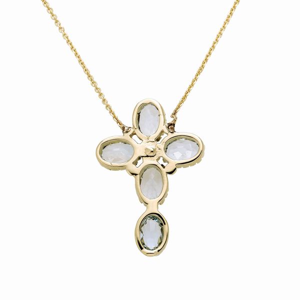 MATERIALE: oro giallo, topazio azzurro e microperla DESCRIZIONE: pendente realizzato come una croce impreziosita da acquamarine taglio ovale con una microperla nel centro, montato come girocollo con catena in oro giallo a maglie intrecciate, reca il marchio 750 MISURE: collana aperta cm 44.5, croce cm 2x 2.8h PESO: gr 4.7