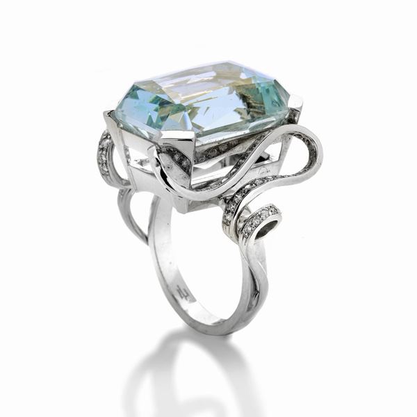 MATERIALE: oro bianco, diamanti e acquamarina DESCRIZIONE: anello realizzato con grande acquamarina taglio smeraldo, impreziosita su ciasun lato da motivo a nastro con diamanti taglio brillante, reca il marchio 750 MISURE: anello 16 PESO: gr 18.6