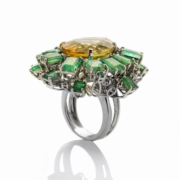 Grande anello in oro giallo, smeraldi e quarzo giallo