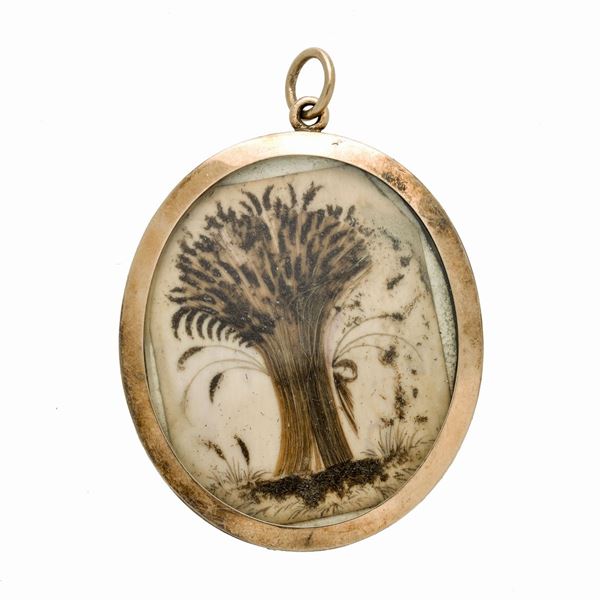 MATERIALE: oro a basso titolo DESCRZIONE: grande pendente ricordo con miniatura raffigurante busto di giovane uomo e nella parte posteriore miniatura raffigurante spighe di grano realizzate con capelli MISURE: cm 4.4x5 h PESO: gr 21.4