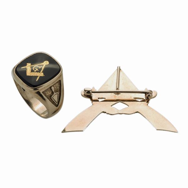 MATERIALE: oro a 10 kt e oro a basso titolo DESCRIZIONE: anello a scudo con smalto nero impreziosito con simboli massonici, con all'interno inciso "Kimberly" e spilla anch'essa con piramide e spade intrecciate, l'anello reca il marchio 10 kt MISURE: anello 22, spilla cm 4.4 x 3.5 h PESO: gr 14.4
