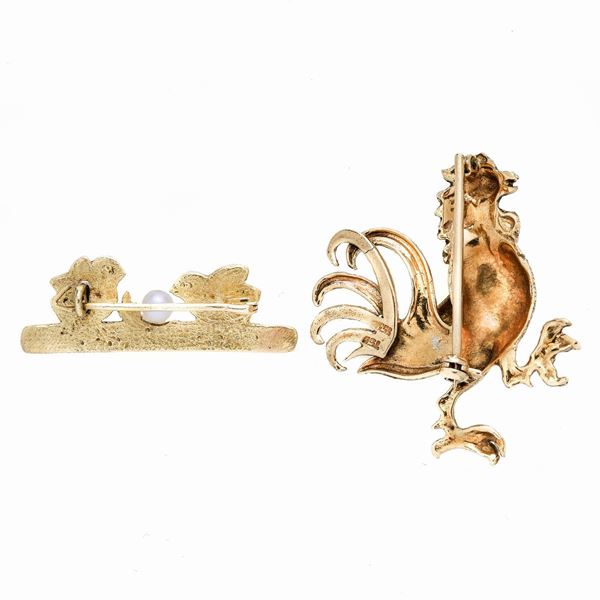 MATERIALE: oro giallo, smalti colorati e perla DESCRIZIONE: spilla realizzata come un gallo con cresta e ali in smalti nei toni del verde, del rosso e del blu, reca il marchio 750 ed un'altra spilla più piccola realizzata con due pulcini e perla al centro, una spilla reca il marchio 750 MISURE: rispettivamente cm 3.2x3.8 h e cm 3.2x 0.8h PESO: gr 13.6