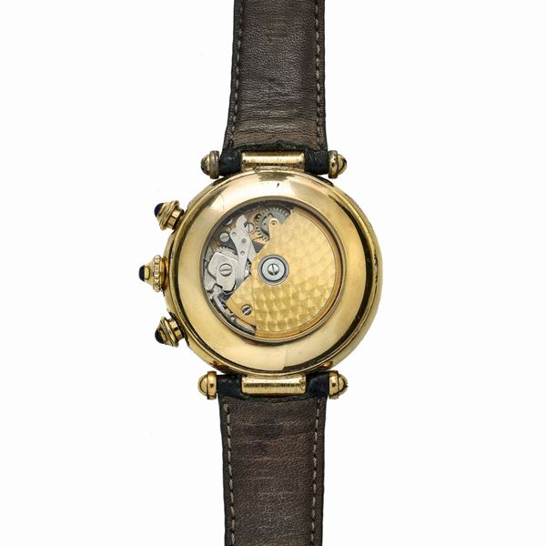 MATERIALE: oro giallo DESCRIZIONE: orologio cronografo da polso, quadrante in smalto con numeri romani, datario ad ore 12, due quadranti ausiliari ad ore 6 e 9, lancette a bastone, pulsanti con zaffiro cabochon, movimento a carica automatica, cinturino in pelle stampata verde non pertinente, reca il marchio 18kt MISURE: diametro mm 37