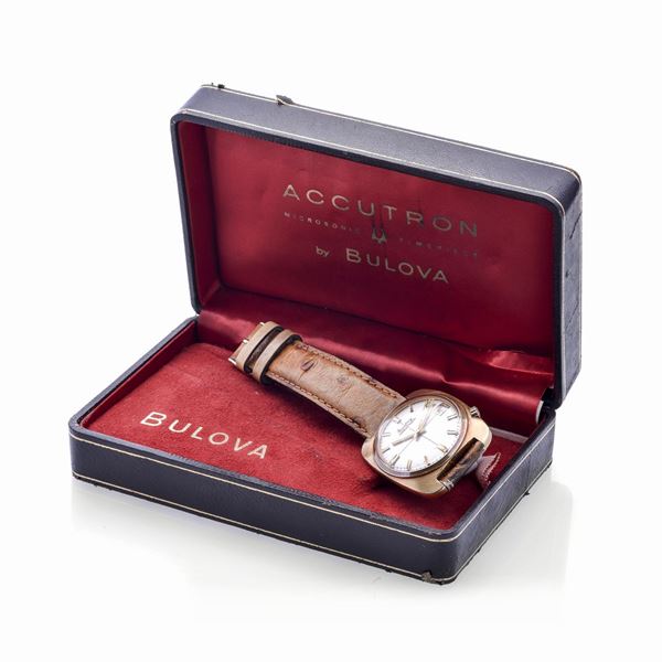 MATERIALE: oro giallo DESCRIZIONE: orologio da polso con cassa tonneau in oro giallo, quadrante circolare color avorio, indici applicati e lancette a bastone, datario ad ore 3, movimento al quarzo, cinturino in pelle marrone stampata non pertinente, reca inciso nella cassa posteriore Bulova waterproof n. 1683812, corredato di scatola originale, da revisionare MISURE: quadrante mm 35