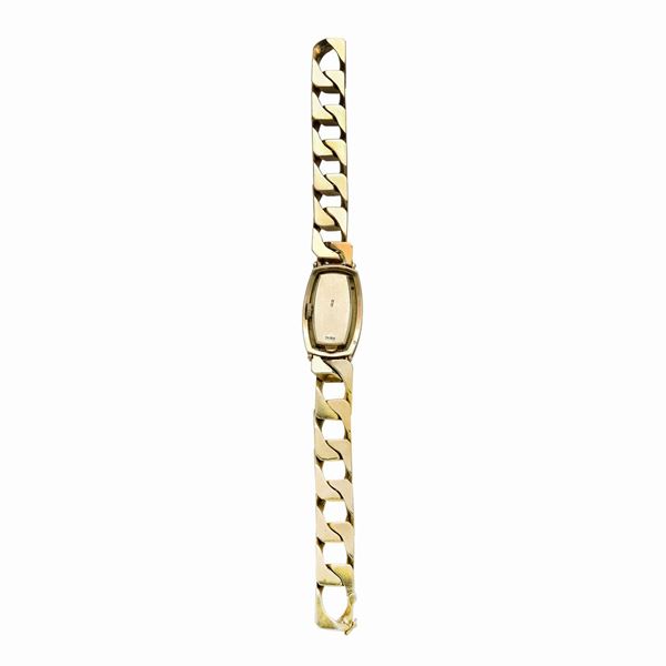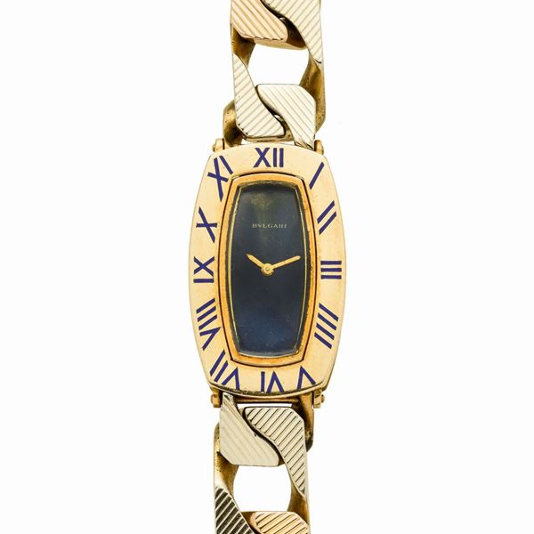 MATERIALE: oro giallo, oro bianco, oro rosa e smalto blu DESCRIZIONE: orologio da signora con cassa rettangolare, lunetta liscia con numeri romani in smalto blu, quadrante ugualmente in smalto blu, lancette a bastone, movimento a carica manuale, bracciale in oro giallo realizzato con maglie a barbazzale piatte e incise, quadrante firmato Bulgari, reca il punzone dell'oro francese e reca inciso il n. di cassa 71726, il bracciale reca il marchio 750 MISURE: bracciale aperto cm 19 e quadrante mm 20 PESO: gr 88.7