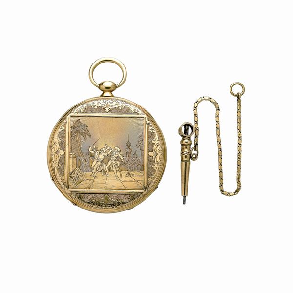 MATERIALE: oro giallo DESCRIZIONE: orologio da tasca, quadrante in smalto bianco, numeri arabi, lancette douphine, quadrante supplementare dei secondi in oro giallo, cassa posteriore in oro giallo inciso raffigurante scena mediorientale, corredato di chiavetta in oro giallo MISURE: quadrante mm 40, gr 34.4 complessivi
