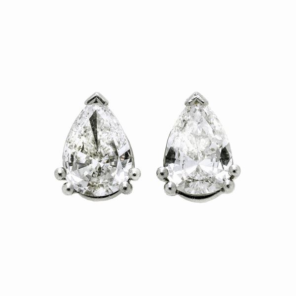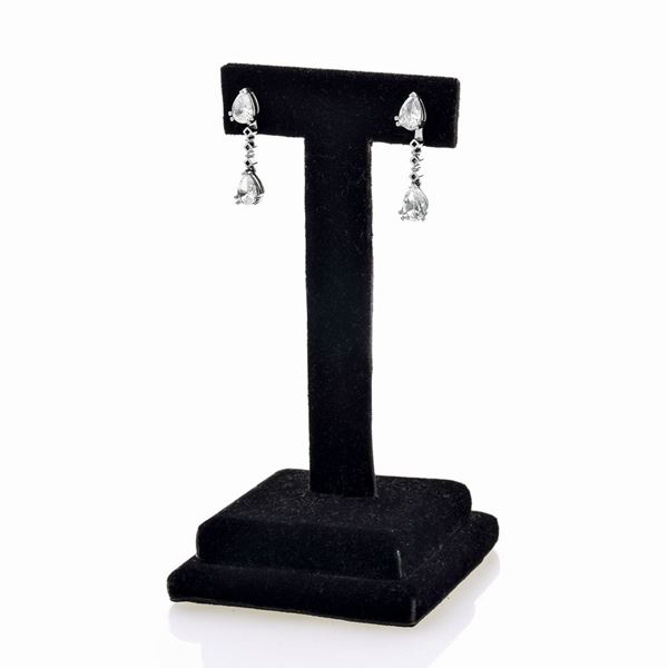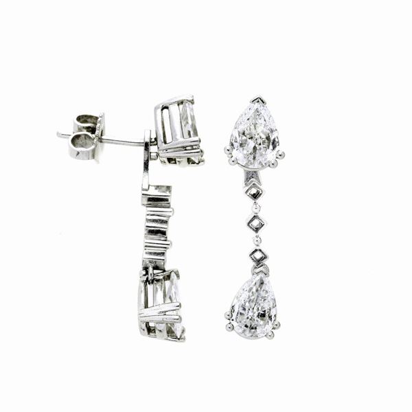 MATERIALE: platino e diamanti DESCRIZIONE: paio di orecchini giorno e sera ciascuno realizzato con clip con diamante taglio goccia e parte pendente con un altro diamante taglio goccia smontabile, farfalline in argento non pertinenti, recano il marchio Plat. MISURE: cm 0.5x 2.5h PESO: diamanti ct 2.0, colore H, VS, gr 7.2