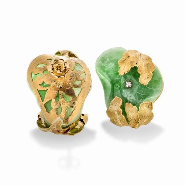 Paio di orecchini in oro giallo, diamanti e giada incisa