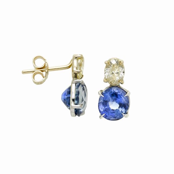 Paio di orecchini in oro giallo, diamanti gialli e zaffiri