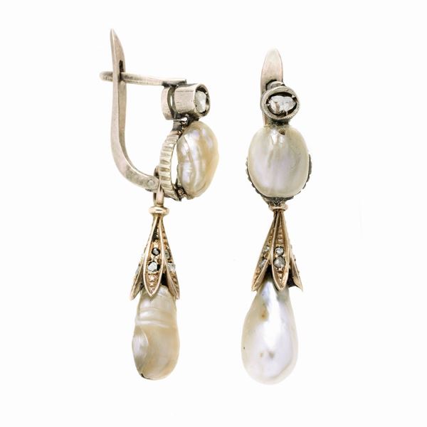Paio di orecchini pendenti in oro a basso titolo, diamanti e perle naturali