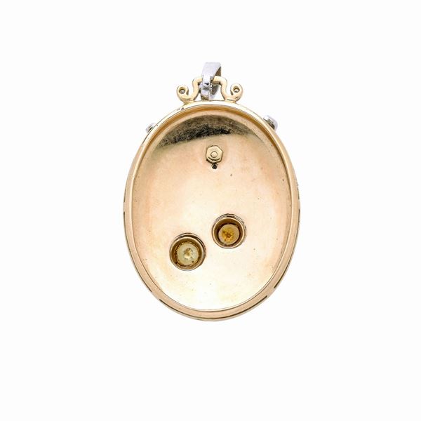 Pendente in oro giallo, oro bianco, smalto rosa, diamanti, diamante brown e diamante arancione