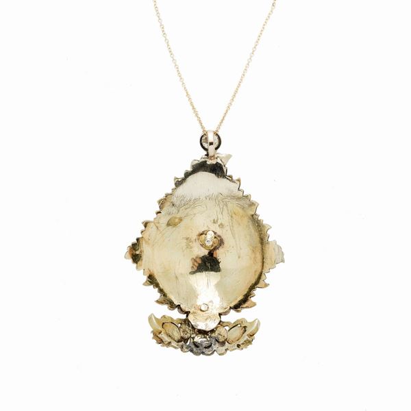 MATERIALE: oro giallo, smeraldi e zaffiri rosa naturali DESCRIZIONE: pendente di ispirazione floreale, leggermente bombato, impreziosito da zaffiri rosa naturali e smeraldi, con catena a maglie intrecciate, questa ultima reca il marchio 750 MISURE: cm 3x 4.5h PESO: zaffiri rosa naturali ct 2.3, corredato di certificato Gemmological Certification Services n. 78138-99, in data 24.01.2018, gr 15.2