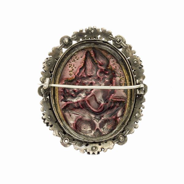 MATERIALE: argento e smalti colorati DESCRIZIONE: spilla con cammeo interamente realizzato in smalti nei toni del marrone, bianco e arancione raffigurante busto di Minerva in cornice impreziosita con granati e fiori in smalto, lievi difetti, corredato di scatola originale MISURE: cm 4.2x 5h PESO: gr 20.1