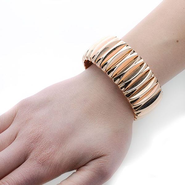 MATERIALE: oro giallo DESCRIZIONE: alto bracciale realizzato con maglie baccellate e sagomate, reca il marchio 750 MISURE: aperto cm 19.5 PESO: gr 99.3